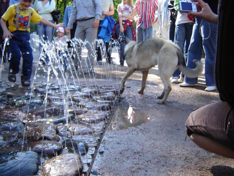 забыла! В Петергофе есть развлекуха в маленькими фонтнчиками, так там была собака-симпотяга, и она ну никак не могла понять, откуда и почему появляются струи воды, и почему их нельзя укусить :)))))