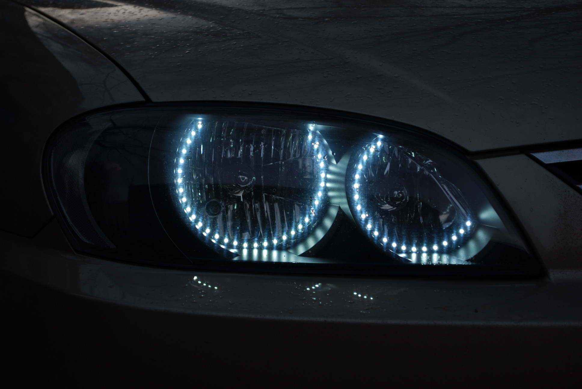 Для этого надо вырезать кольца по форме фары, я вырезал из полистирола, присобачить на неё светодиоды, резисторы, спаять их между собой, покрасить всё это дело приклеить кольца на пластиковую вставку, что внутри фары и вывести провода для подключения. Подключать к эл. системе авто через резистор или стабилизатор напряжения, потому что диодные сборки на 12В, а в авто 14,4В. Вот, вкратце, как-то так.